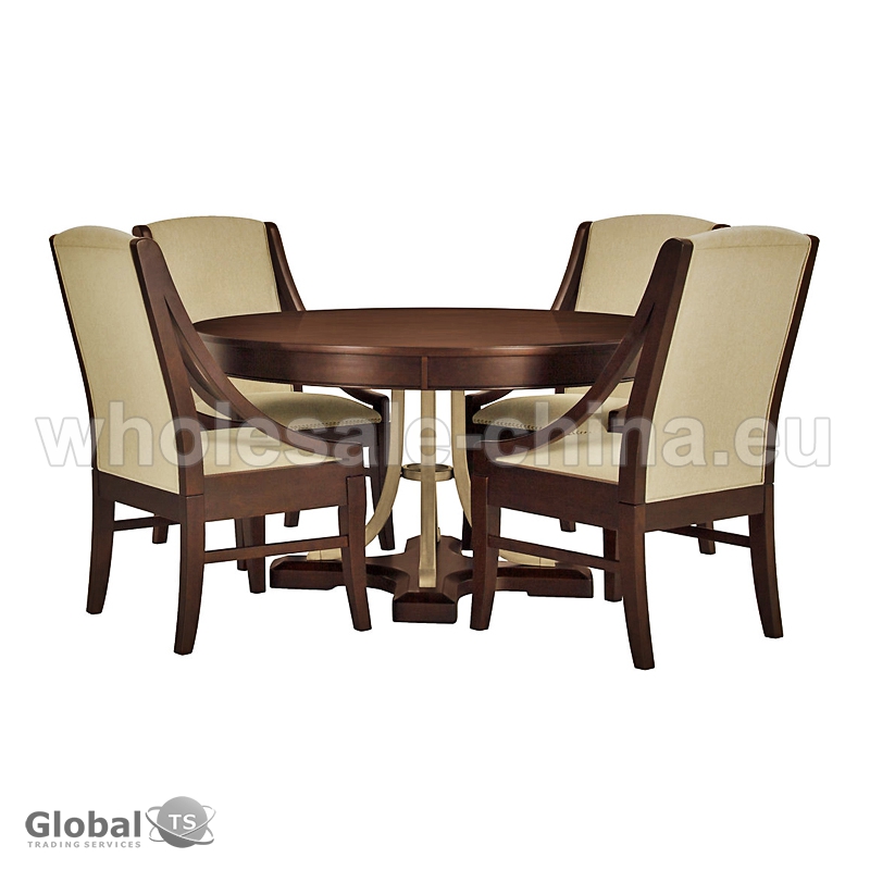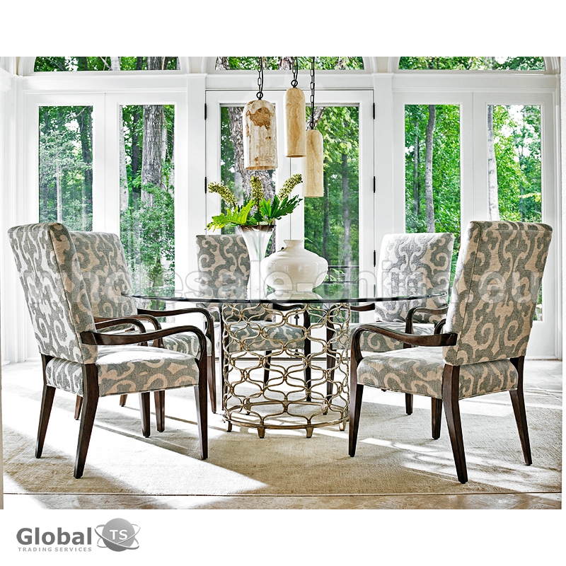 Magnífico conjunto de comedor de estilo europeo. Se compone de una mesa de forma redonda y 6 sillas. Los materiales utilizados para su fabricación son los siguientes: madera maciza, vidrio de alta calidad, elementos hechos a mano de hierro forjado de decoración. Asientos y respaldos blandos, cómodos apoyabrazos de madera de las sillas proporcionan el máximo confort a sus huéspedes y visitantes.