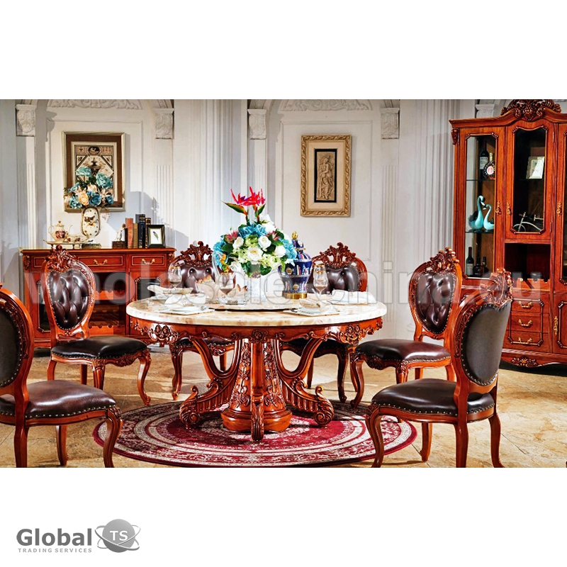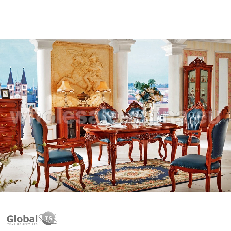 Juego de comedor de estilo antiguo que consiste completamente de tecnología de talla hecha a mano. Incluye: una mesa rectangular y seis cómodas sillas. Conjunto no sólo se ve lujosamente, pero también es muy práctico en el uso. La alta calidad de la producción de la mesa y de las sillas ofrecida garantiza un servicio largo e impecable de este conjunto de comedor.Garantía es de un año.