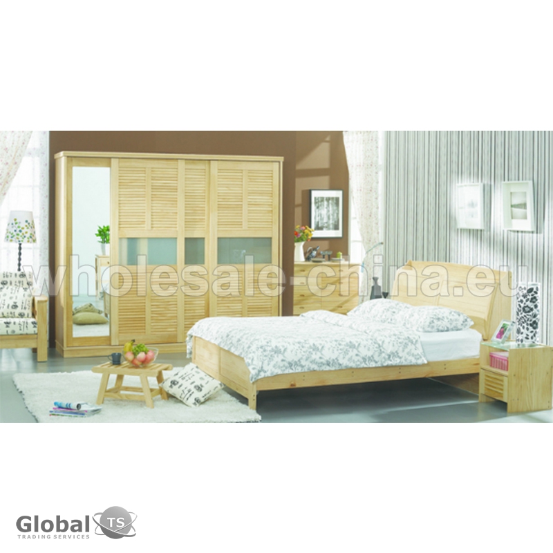 Nice and simple bedroom set which consists of comfortable bed, wardrobe and bedside table. Made of solid wood material it characterized as durable and can serve for many years. Customization is available, so you can buy the needed size.