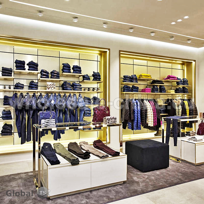 Convenient and practical display clothing rack with hangers and mirror. Classical combination of colors gives an ideal interior design of any brand clothing shops. We mind on every requirement of our customers, so you can be sure that we’ll provide different variants of your individual project taking into account size, specific design and color palette. Durable structure and easy to install.