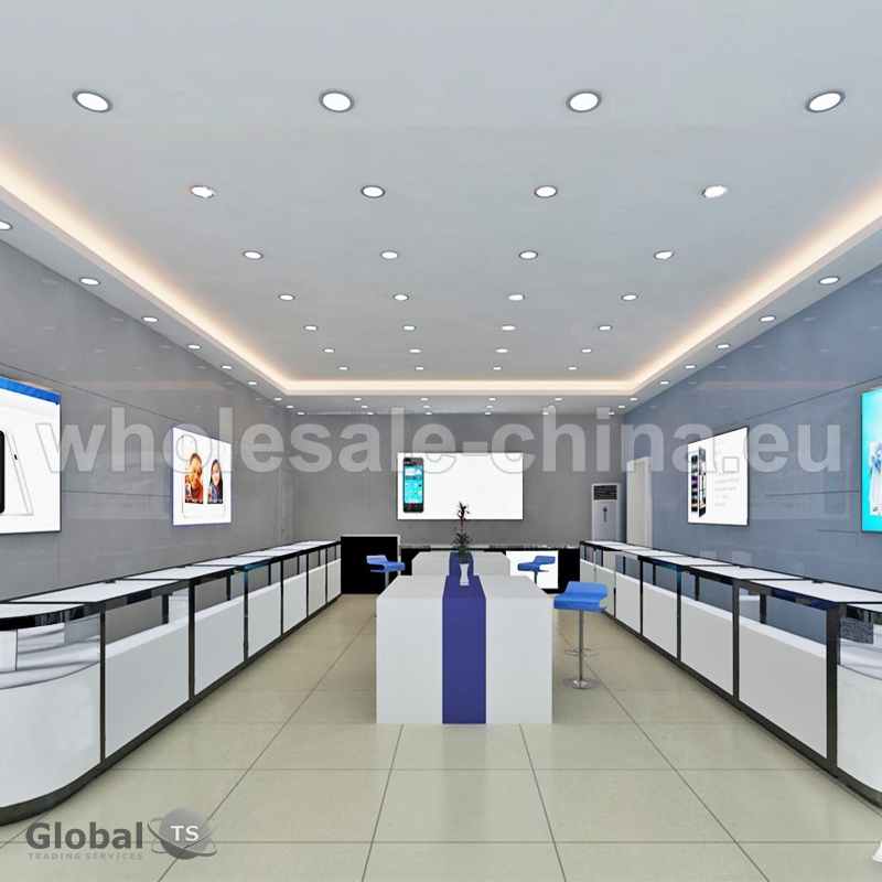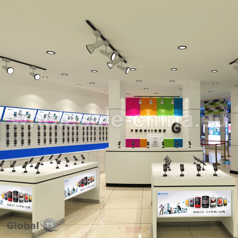 You can see the most popular design for mobile shop. There are different kinds of displays for presentation of your products. Everything is customized, so we will make a perfect design for you. Main materials are MDF and tempered glass. We use only high-quality materials.