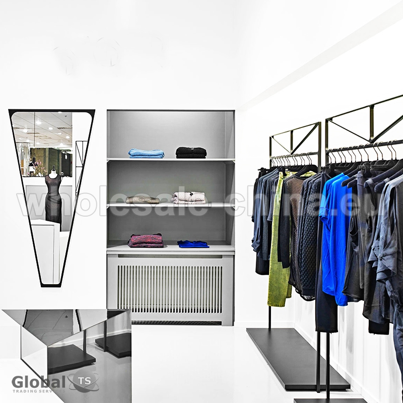 Convenient and practical display clothing rack with hangers and mirror. Classical combination of colors gives an ideal interior design of any brand clothing shops. We mind on every requirement of our customers, so you can be sure that we’ll provide different variants of your individual project taking into account size, specific design and color palette. Durable structure and easy to install.